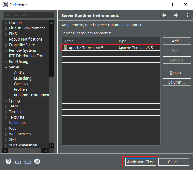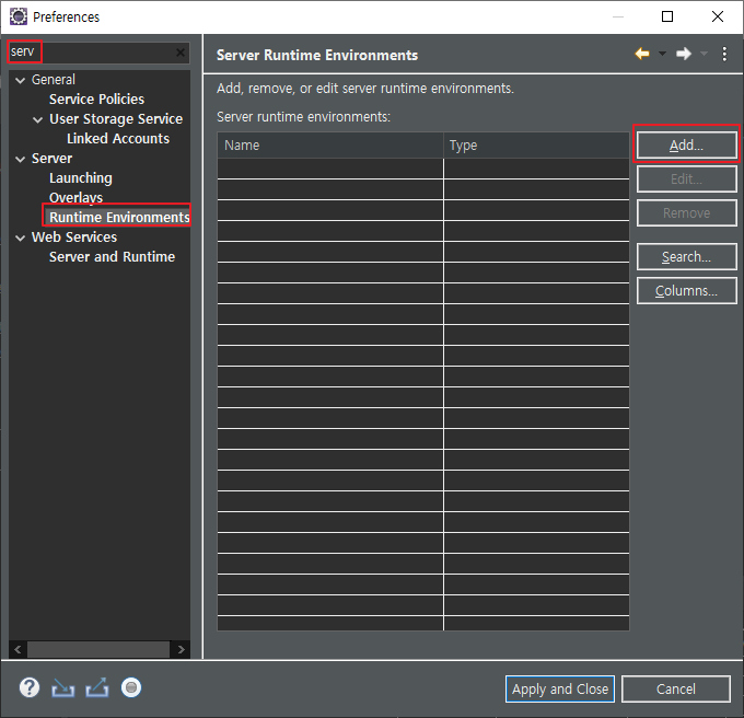 - 검색창 Server 입력 > Runtime Environments 클릭 > Add... 클릭