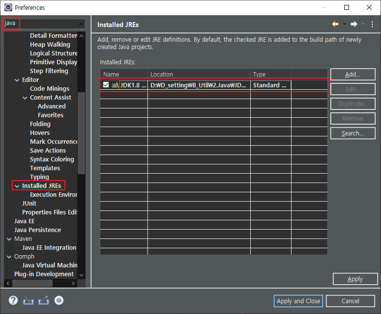 - 검색창 java 입력 > Installed JREs 클릭 > 자바 버전 맞는지 확인
