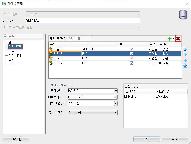 제약조건 클릭 > 외래키(빨간줄표시) 클릭 > X(삭제) 클릭 > 확인 클릭