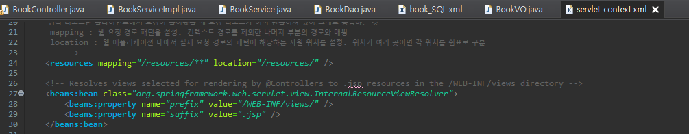 prefix(접두어) : /WEB-INF/views/ ,suffix(접미어) : .jsp ⇒ jsp 경로위치 앞 뒤로 붙힘 ex)/WEB-INF/views/ + book/create + .jsp