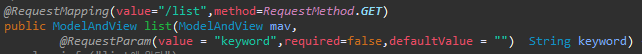 요청URI : /list?keyword=알탄 or /list or /list?keyword= 요청파라미터 : keyword=알탄 요청방식 : get required=false : 선택사항. 파라미터가 없어도 무관 defaultValue ⇒ 기본값 String keyword ⇒ jsp에서 요청파라미터 보낸 값 받음