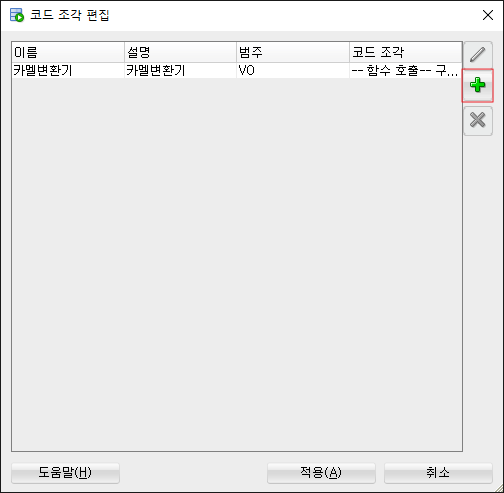 범주, 이름, 도구 설명, 코드 조각 작성 > 적용 클릭
