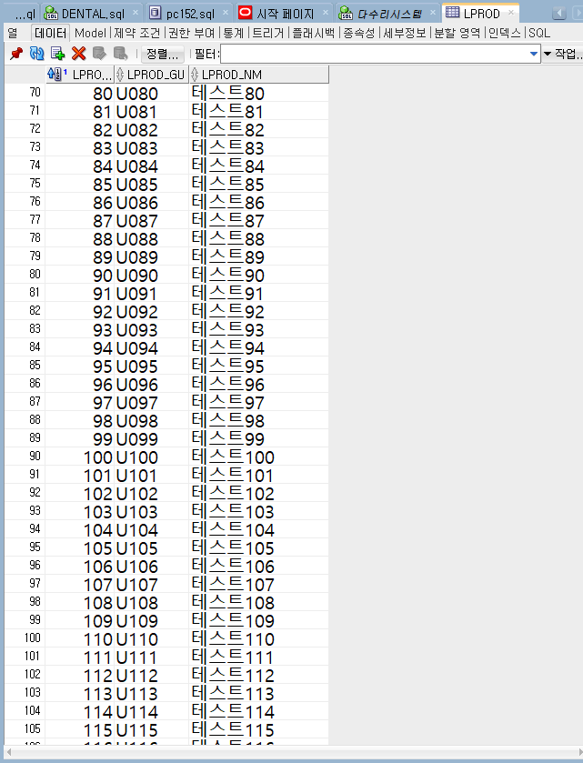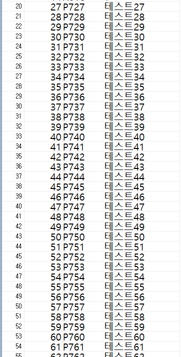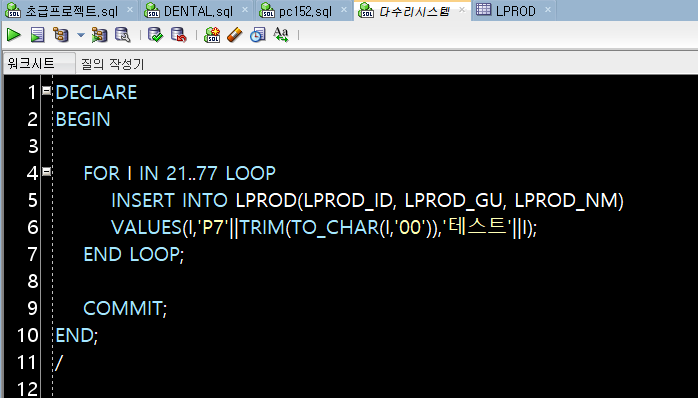 VALUES(I, 'P7'||TRIM(TO_CHAR(I,'00')), '테스트'||I);
