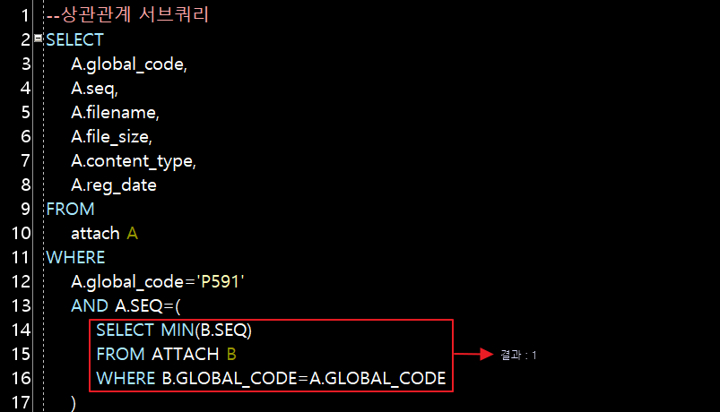 상관관계 서브쿼리 : main 쿼리의 특정 컬럼의 기본키 데이터가 sub쿼리의 조건으로 사용되고 sub쿼리의 select 결과