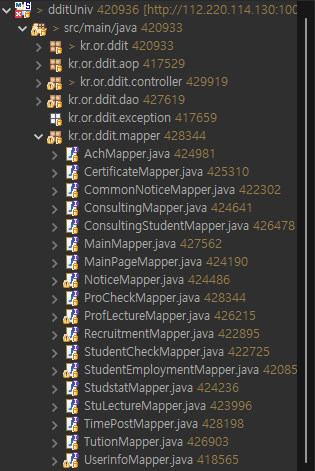 - 이 경우, kr.or.ddit.mapper 패키지 아래에 있는 모든 Mapper 인터페이스를 스캔하여 MyBatis의 SQL 세션에 등록합니다.
