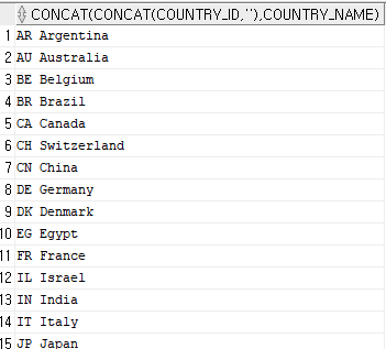 SELECT COUNTRY_ID||' '||COUNTRY_NAME FROM COUNTRIES;