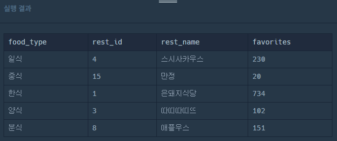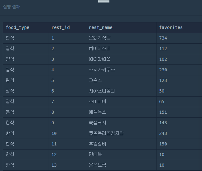 SELECT FOOD_TYPE,REST_ID,REST_NAME,FAVORITES
