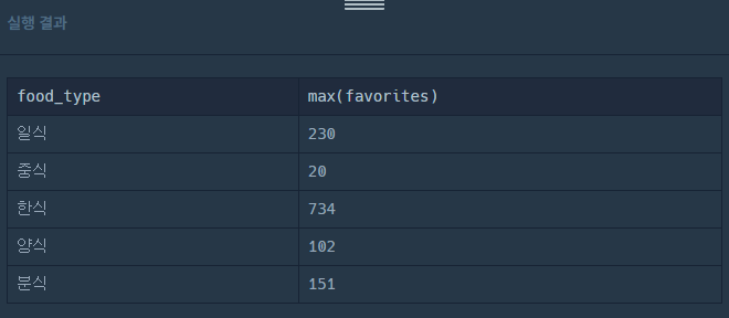 WHERE (FOOD_TYPE,FAVORITES) IN (SELECT FOOD_TYPE,MAX(FAVORITES)