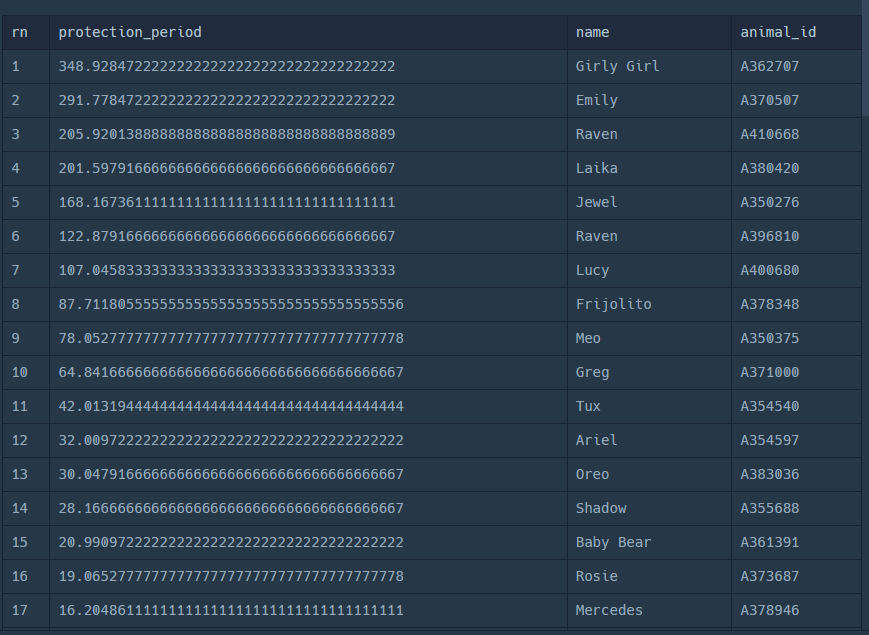 SELECT B.DATETIME- A.DATETIME protection_period ,A.NAME,A.ANIMAL_ID