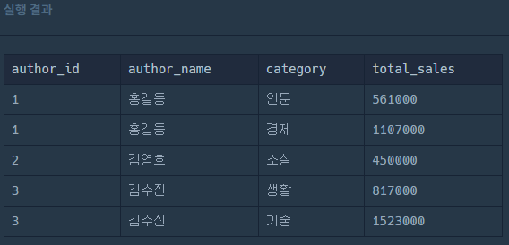 SELECT A.AUTHOR_ID,AUTHOR_NAME,CATEGORY,SUM(C.SALES * PRICE) TOTAL_SALES